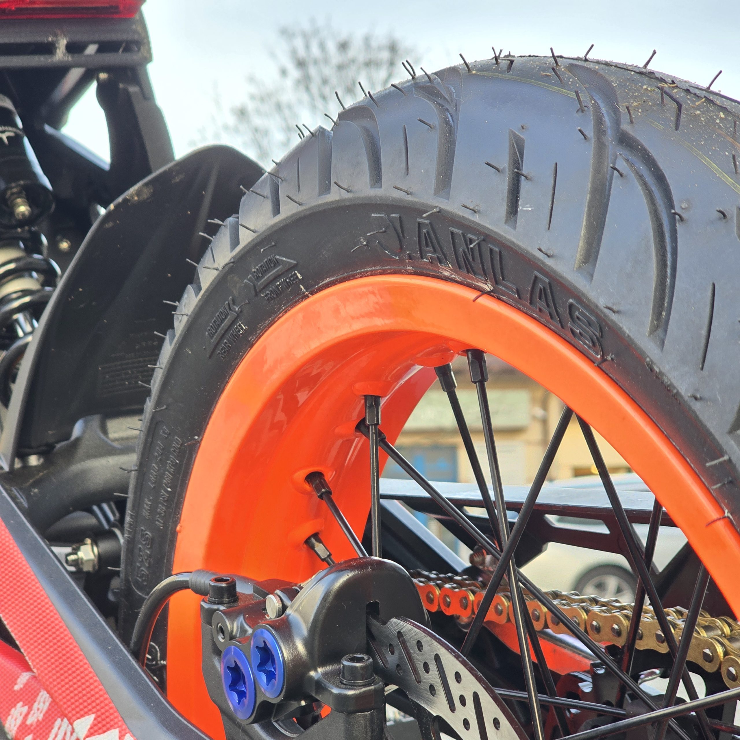 ➤ Dwukrotnie większe hamulce motocyklowe zasilane płynem DOT oraz grube 3mm tarcze hamulcowe zapewniają ogromny wzrost siły hamowania oraz dużo dłuższą żywotność klocków hamulcowych